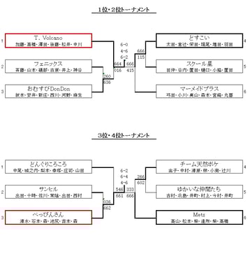 1位2位トーナメントは「T.Volcano」の優勝、「どすこい」が準優勝、3位4位トーナメントは「べっぴんさん」の優勝、「Mets」の準優勝で幕を閉じました。